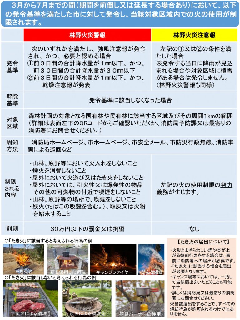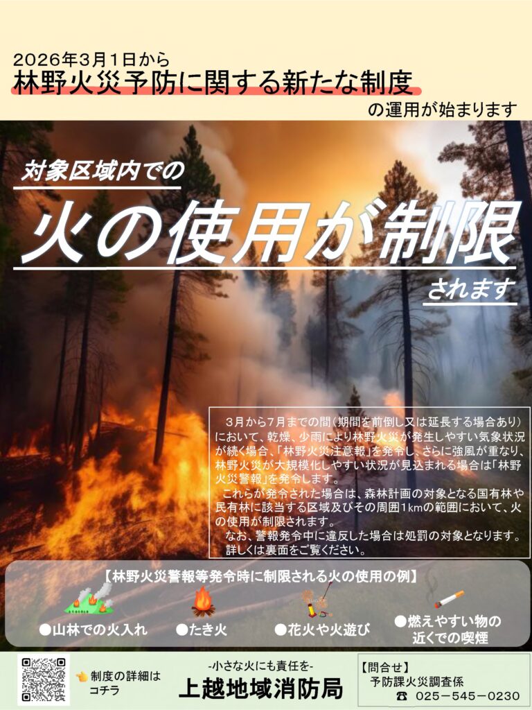 上越地域消防局では、4月1日から春の火災予防運動と山火事・たき火火災防止運動の二つを展開します。令和8年3月1日(日)から「林野火災注意報」、「林野火災警報」の運用を開始して最初の行事となることから、引き続き火災予防をお願いします。