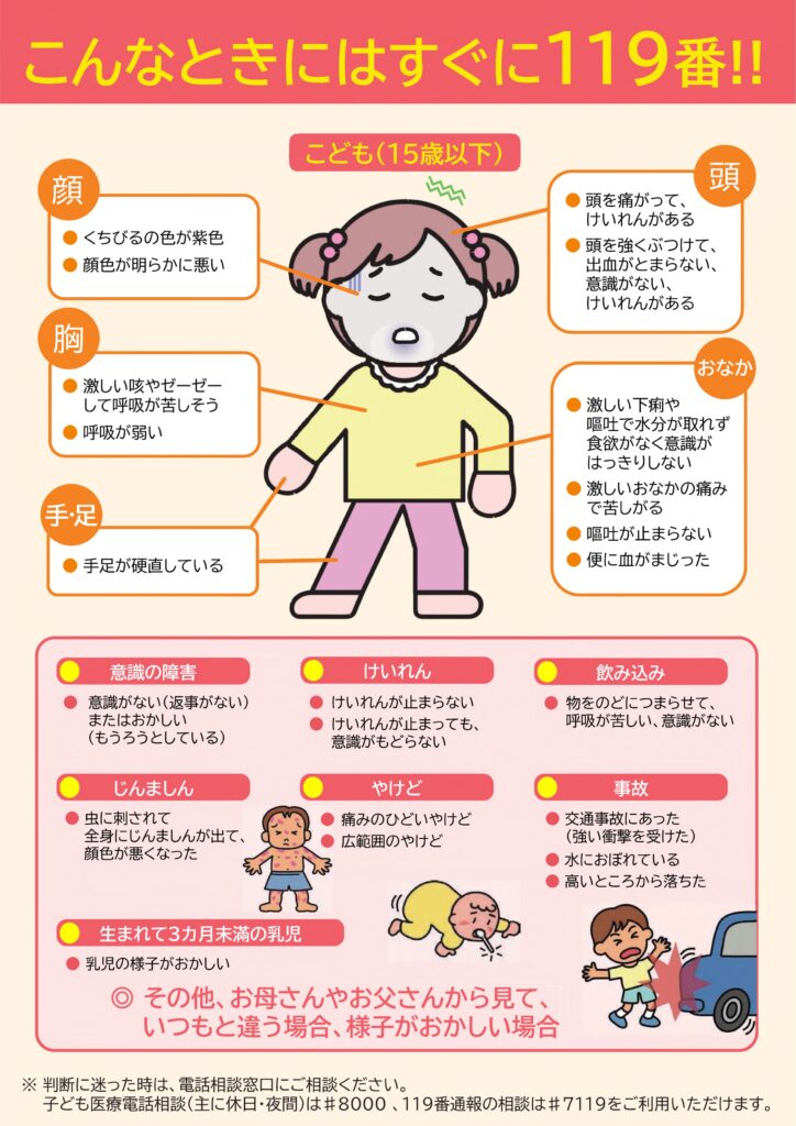 夜間の急な病気やけがで、すぐに救急車を呼ぶべきか、医療機関を受診すべきか、判断に迷ったときには、看護師等から受診の必要性や対処方法等についての助言、受診可能な医療機関の案内を受けることができる救急医療電話相談(#7119)と小児救急医療電話相談(#8000)を御活用ください。