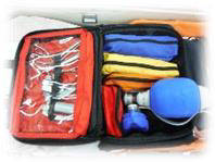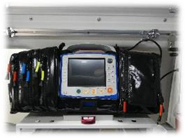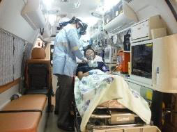 救急車内には血圧や呼吸状態、心電図などの監視モニター、AED、自動心マッサージ器など100種類以上の資器材が装備されており、傷病者の容態に合わせた救急措置を行うことができます。